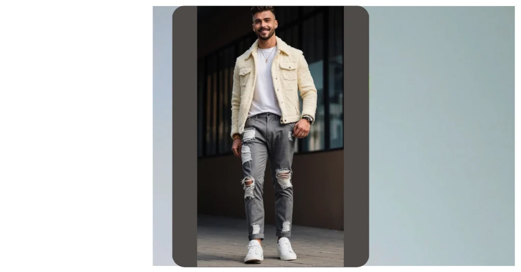 While that fuzzy jacket is giving off major cozy vibes, his gray ripped jeans are clearly here to party! We’re talking more holes than a golf course, making you wonder if he had a wrestling match with a paper shredder before leaving the house. But hey, that’s what NYFW street style is all about – taking something a little wild and making it fashion. Paired with those crisp white sneakers, he’s nailing that effortlessly cool guy look that’s both edgy and super approachable. It just goes to show, you can literally wear holes in your pants and still look like a style icon!