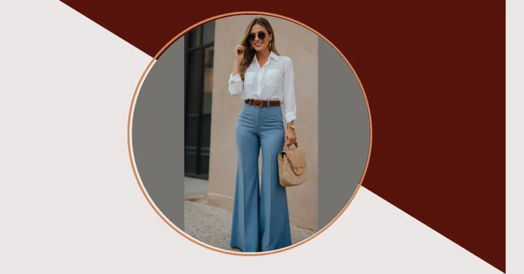 Check out this fashion queen! She’s totally rocking that ‘over 40’ vibe, proving that age has absolutely nothing on style. Who says you can’t look incredibly chic and super comfy at the same time? Those amazing blue wide-leg pants are probably so breezy they feel like a secret cloud, especially when paired with that crisp white shirt and a perfectly cinched brown belt. She looks like she’s ready to conquer her day, maybe even with a secret latte, all while looking effortlessly fabulous.