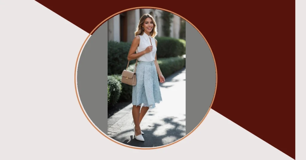 Stepping into the office in an outfit like this definitely makes you feel like you’ve got your life together, even if your to-do list is actually a chaotic mess of sticky notes. Our pal here is totally nailing the ‘I mean business but also could be heading to a fancy brunch’ look with that crisp white top and super cute blue lace skirt. It’s the kind of work outfit that screams, ‘Yes, I finished my reports, and yes, I remembered to feed my pet rock this morning!’ — making adulting look way cooler than it probably is on a Monday.