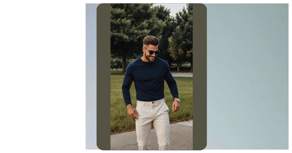 Finding the sweet spot for fall outfits can sometimes feel like trying to guess the exact moment your teacher will assign a pop quiz – it’s tricky! But this dude in the picture clearly aced the style test. He’s rocking a sleek navy sweater that’s perfect for those ‘too cool for a t-shirt, too warm for a full winter coat’ days. Paired with those crisp cream trousers, he looks like he effortlessly strolled out of a fashion magazine, not like he’s secretly debating if he left the oven on. This look basically says, “Yeah, I’m comfortable, but I also totally have my life together.”