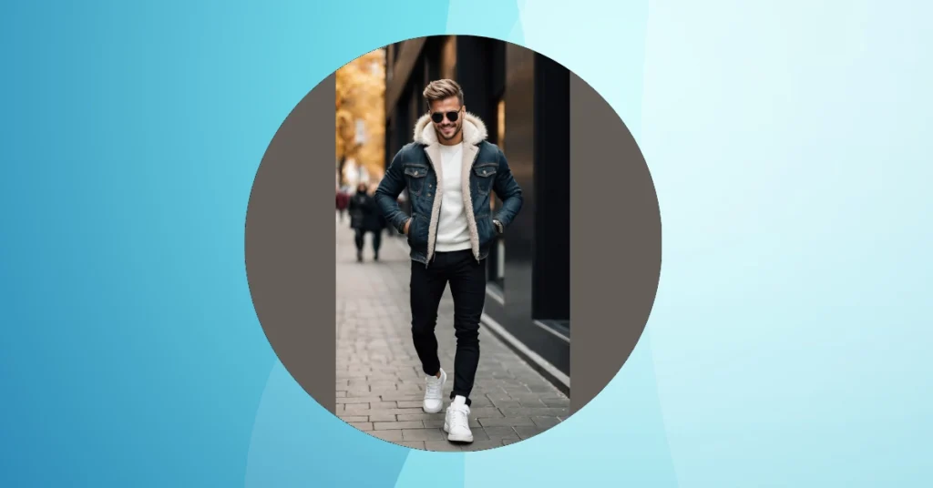 Who knew looking effortlessly cool for fall could be this simple? This dude clearly got the memo: when the leaves start turning, it’s time to bust out the cozy but classy gear. His sherpa-lined denim jacket is basically a warm hug disguised as a fashion statement, perfect for those mornings when you can practically see your breath. Paired with a crisp white sweater and dark pants, he’s basically saying, “Yeah, I look good, and I’m not even trying… much.” Plus, those shades are probably hiding the fact he’s still half asleep from hitting snooze too many times.