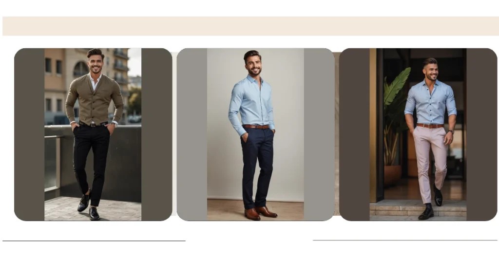 But it’s not just about keeping your pants up with style; this outfit shows how simple pieces can become super sharp. The crisp shirt, the perfectly fitted dark pants, and those awesome brown shoes and belt tie it all together so you look polished from head to toe. You might even feel smarter just wearing it! While it probably won’t help you magically ace your math test, rocking an outfit like this definitely boosts your confidence, making you feel ready to conquer the world – or at least that awkward group project. Who knew “mens work outfits” could be this cool and comfortable, making you look like the most put-together person in the room?