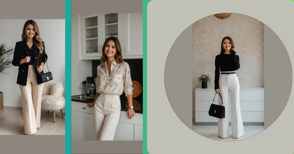 And let’s talk about those super sleek, cream-colored pants! They look comfy enough for a study session but sharp enough for a big presentation – basically, the dream combo. This whole ensemble is the ultimate ‘elegant woman outfit’ that says, ‘I’m ready for anything, whether it’s a super important meeting or just realizing I left my phone on the counter.’ It just goes to show you can bring serious style to your everyday, even if your biggest plan is figuring out what’s for dinner (again!).