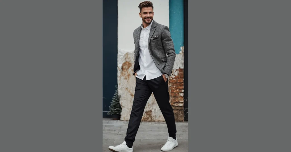 You know how winter usually means choosing between looking cool and actually feeling your toes? It’s usually a tough choice, often resulting in you resembling a bundled-up marshmallow or a walking sleeping bag. But hold up! This guy totally cracked the code. He’s rocking a sharp grey blazer that probably feels like a warm hug, paired with dark pants and a fresh white tee. It’s like he figured out how to stay cozy without looking like he just rolled out of bed after a blizzard.