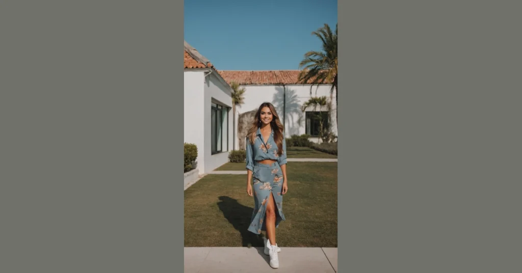 Check out this awesome sunny day outfit! Our friend here is absolutely rocking this blue floral two-piece set, looking totally ready for a chill afternoon or even a fancy-but-still-comfy brunch. The crop top and flowy skirt with that cool slit give off major confident vibes, and those crisp white sneakers? Genius! They just scream ‘I’m stylish, but I can also run for the ice cream truck if I need to.’ It’s the perfect blend of cute and comfortable, making you want to grab your sunnies and step out with a big smile, just like she is.
