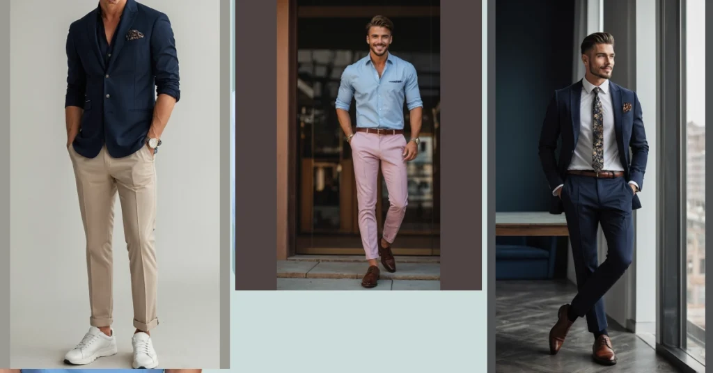 Think office wear means saying goodbye to comfort and hello to stiff suits? Nope! This look totally flips the script, showing how you can rock a super sharp navy blazer and still look like you’re ready for anything – not just a boring meeting. He’s ditched the tie for a relaxed, unbuttoned shirt and even added a cool patterned pocket square, proving that looking good at work doesn’t have to feel like you’re wearing a costume. It’s the perfect mix of “I mean business” and “I’m probably more fun than my boss.”