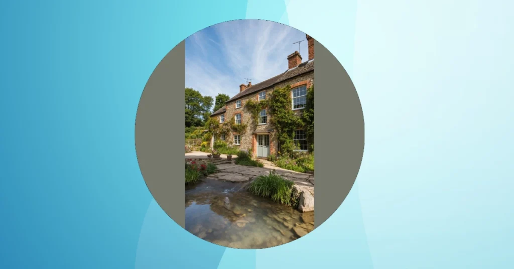 Looking at this photo, you might feel like you’ve just walked into a classic British movie, or maybe the world’s coziest postcard! This charming stone house is practically dripping with greenery and blooming flowers, like it’s been getting fancy for ages. It screams ‘English countryside photography goals’ so loudly, you can almost hear the birds chirping and taste the afternoon tea. And check out that stream – who needs a complicated front path when you can have a babbling brook right at your doorstep? Just try not to mistake it for your morning coffee!