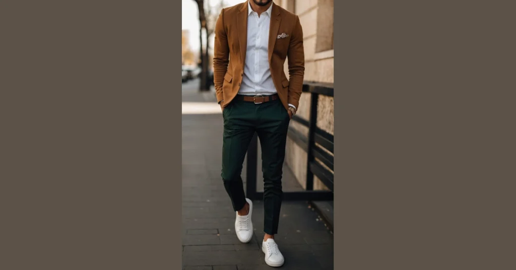 When the leaves start changing colors, your wardrobe should too! Check out this guy who clearly got the memo about looking sharp for fall without looking like he’s trying too hard. He’s rocking a cool brown blazer that’s basically the color of a pumpkin spice latte (but way more stylish), paired with deep green pants that scream “I know what I’m doing.” It’s like he just rolled out of bed, decided to conquer the day, and accidentally put on an outfit that makes everyone else think he’s a fashion wizard. Plus, those crisp white sneakers? They’re the secret ingredient that says, “Yeah, I’m fancy, but I could also sprint for the bus if I needed to.”