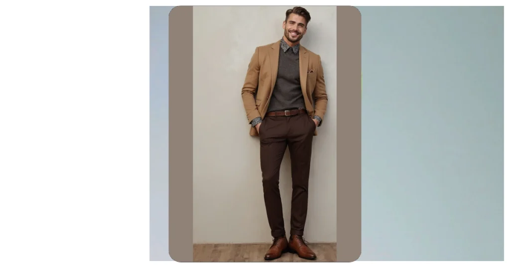 When the leaves start to turn golden and the air gets that perfect crisp coolness, this guy clearly got the memo: fall fashion isn’t just about staying warm, it’s about looking effortlessly cool. Check out that outfit! The sharp camel blazer over a cozy dark sweater and a snazzy patterned shirt screams ‘I’m ready for anything autumn throws at me, from a bonfire to a fancy coffee run.’ He’s totally rocking those earthy tones like they’re going out of style (spoiler: they’re not!), and honestly, it makes you want to hear the satisfying crunch of leaves under his perfectly matched brown shoes.