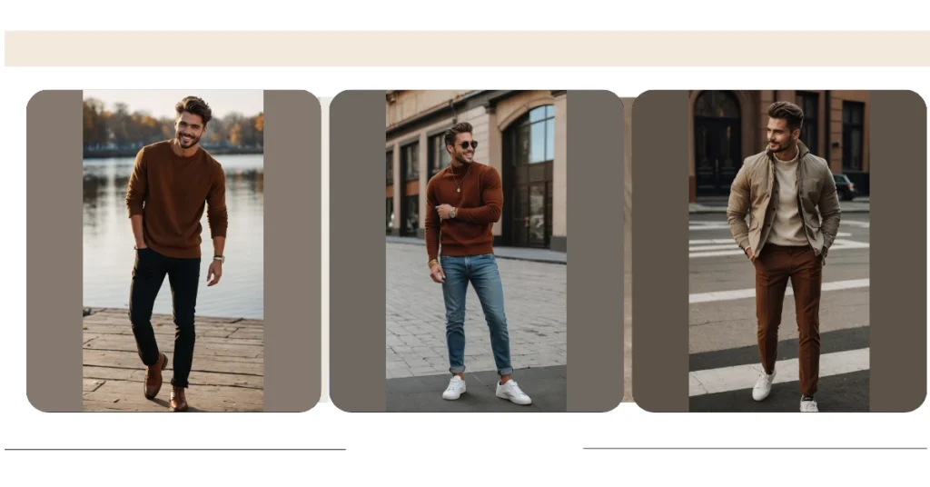 Feeling like you need an outfit that says ‘I totally meant to look this good, and also, where’s the pumpkin spice?’ This guy has absolutely mastered the art of men’s fall outfits. That cozy-looking brown sweater is basically a warm hug disguised as fashion, perfect for those crisp autumn days when the leaves are doing their pretty color-changing thing. He’s smiling like he just found a twenty in his old jeans, probably because he knows he’s rocking the perfect balance of comfort and style. You don’t need a complex wardrobe when a fantastic sweater can do all the heavy lifting for your autumn look.