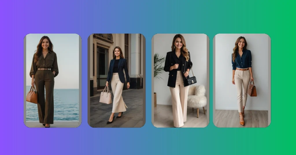 Talk about an outfit that says, “I’ve got my life together, and probably my coffee too!” This look is the definition of an elegant women outfit without being stuffy. She’s got that perfectly tucked-in navy shirt, looking sharp enough for a fancy event but comfy enough to secretly binge-watch your favorite show. And those beige pants? They’re practically whispering, “I’m sophisticated, but I can still totally handle a surprise pop quiz on fashion history.” It’s the kind of coordinated magic that makes you wonder if she hired a stylist or just has super powers.
