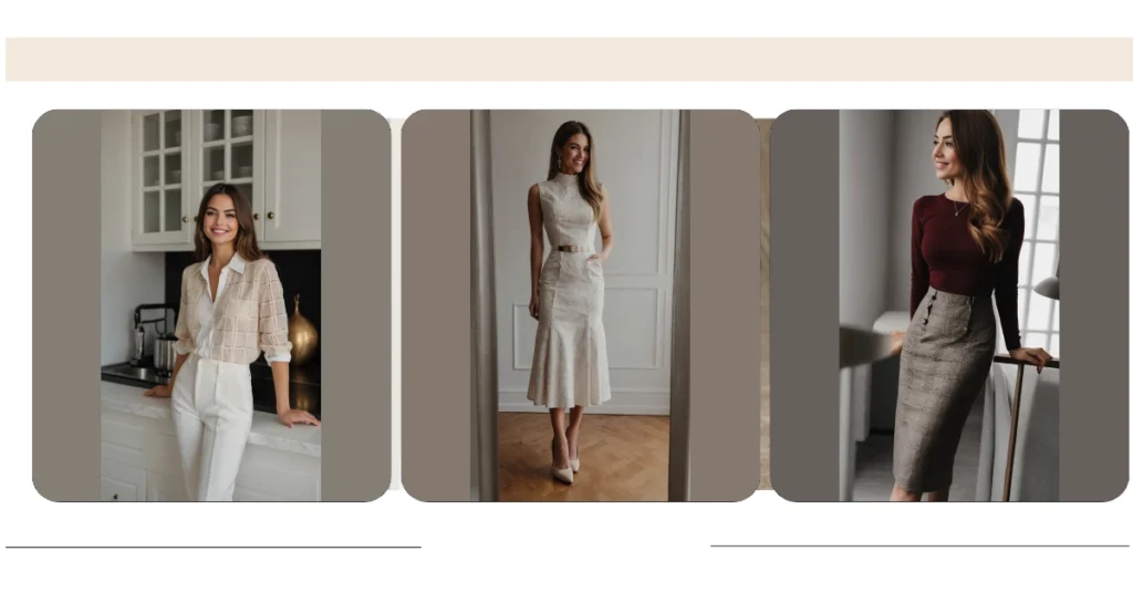 It’s like this outfit is screaming, “I’m professional, approachable, and probably have my life together!” This style is perfect for those days when you need to switch from a serious meeting to, say, debating with your pet why they can’t have more treats. It shows how work outfits don’t have to be boring. Who knew looking sharp for work could also mean being perfectly prepped to make a gourmet lunch or just patiently wait for the toaster? This look proves you can be comfy, stylish, and ready for whatever your “work” throws at you – even if “work” means just trying to find where you left your charger.