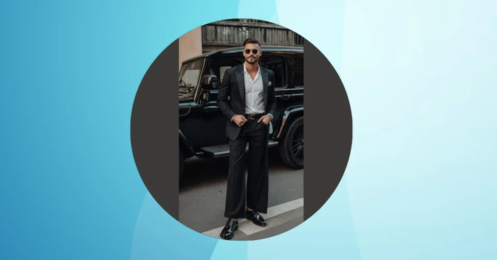 But let’s be real, the true star of this outfit might just be those incredible wide-leg trousers! They’re not your typical skinny-fit suit pants, and that’s exactly what makes them stand out in the crowded NYFW scene. These pants are having a whole fashion moment on their own, giving off a relaxed yet super polished feel. Paired with those super shiny, patent leather shoes, he’s proving that men’s fashion can be both incredibly classy and surprisingly comfortable, ready to strut down any street with confidence and a smirk that says, “Yeah, I know I look good.”
